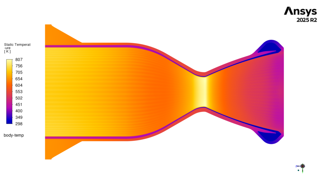 Unlike its predecessor Arrax, Redwing is cooled exclusively by the fuel and does not require any water cooling. Instead of being routed directly to the injector plate, the fuel is supplied to the engine at the nozzle. Each second, 1.4 kg of isopropanol flows through the cooling channels, absorbing the heat generated by combustion and keeping the wall temperature below 500 °C, while the hot gas temperature in the chamber exceeds 3,000 °C!